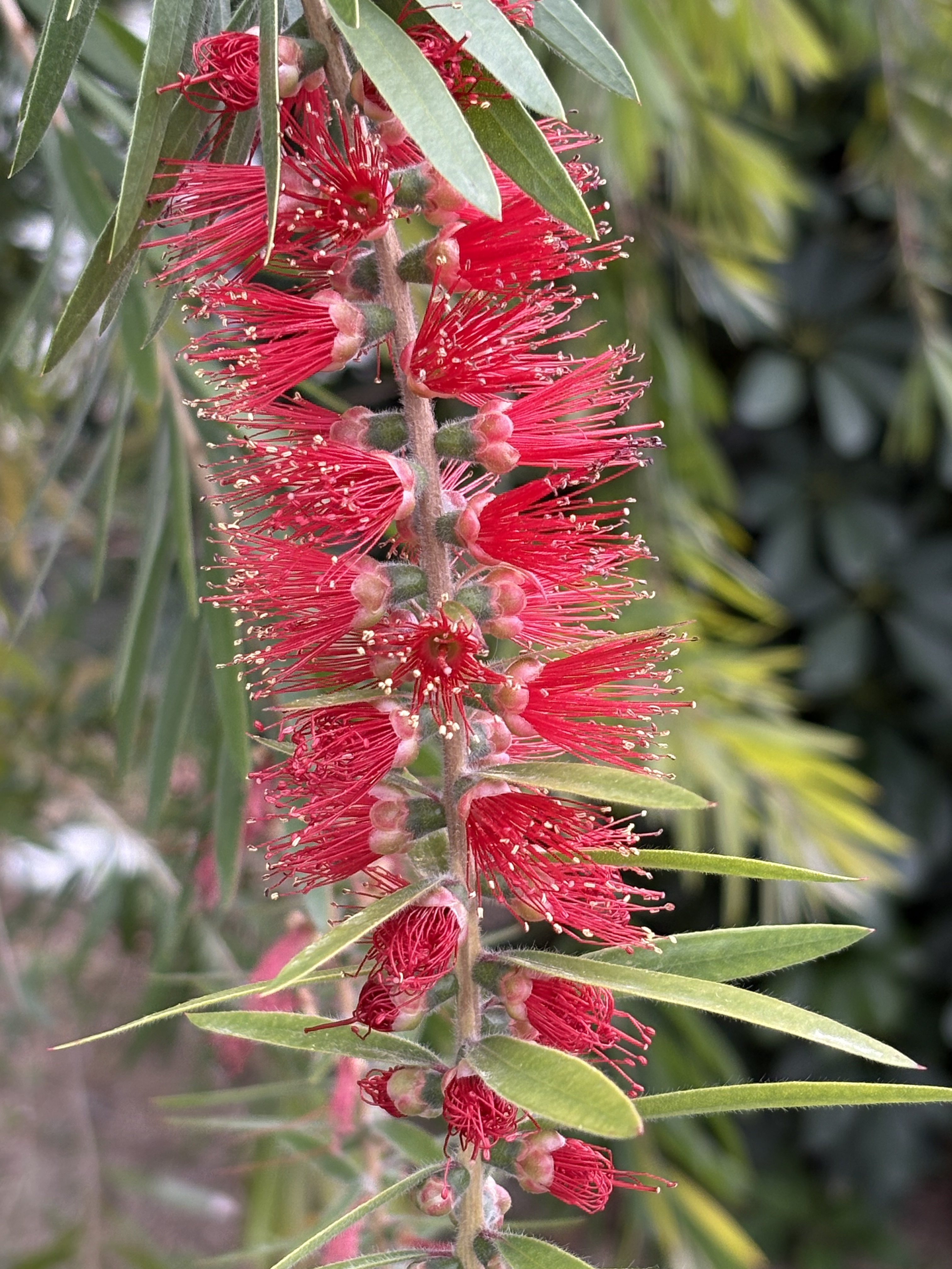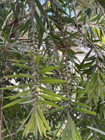 今になって、玄関の枝垂れブラシの木の花が咲き出しました(汗)